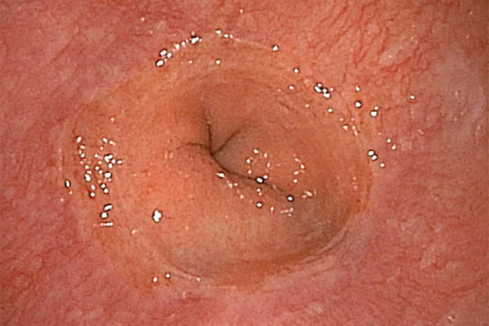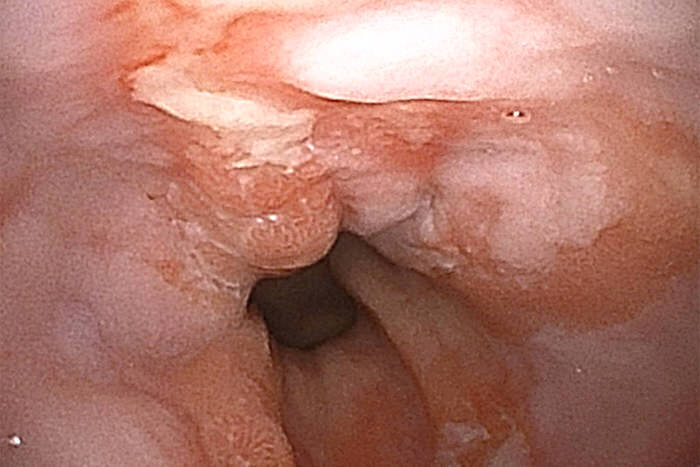 따라서 본원에서는 기본적으로 두 번째 방법인 치료 전에 위내시경 검사(위 카메라)를 받을 것을 권장하고 있습니다. 내시경 검사에서는 사진과 같이 실제로 식도의 점막에 흠집이 생겨, 미란을 형성하고 있는지를 알 수 있습니다. 이와 같이 위내시경 검사에서는 증상이 실제로 역류성 식도염에 의한 것임을 확인하고 심각도를 고려한 치료를 할 수 있습니다.